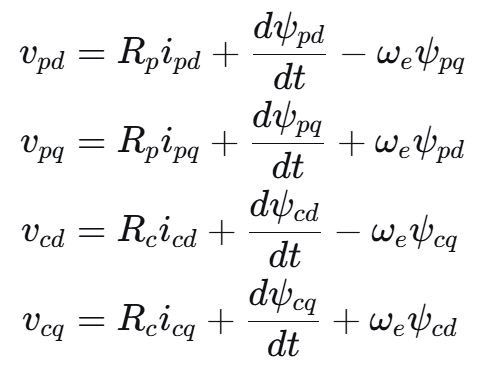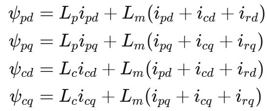 其中下标$p$和$c$分别代表功率绕组和控制绕组,$d$和$q$代表同步旋转坐标系的两个轴分量。磁链方程则更为复杂,需要考虑两套绕组之间的互感: